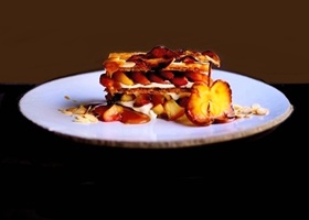 13. Monter les mille-feuilles juste avant de servir : enduire un rectangle de pâte feuilletée de caramel, puis garnir de compote de pommes ; couvrir ensuite d'un autre rectangle enduit de caramel ; y déposer les tranches de pommes ; terminer par un rectangle et le napper de caramel ; parsemer d'amandes effilées grillées.